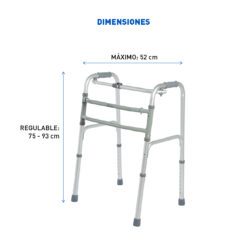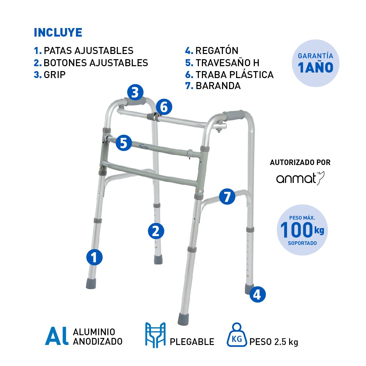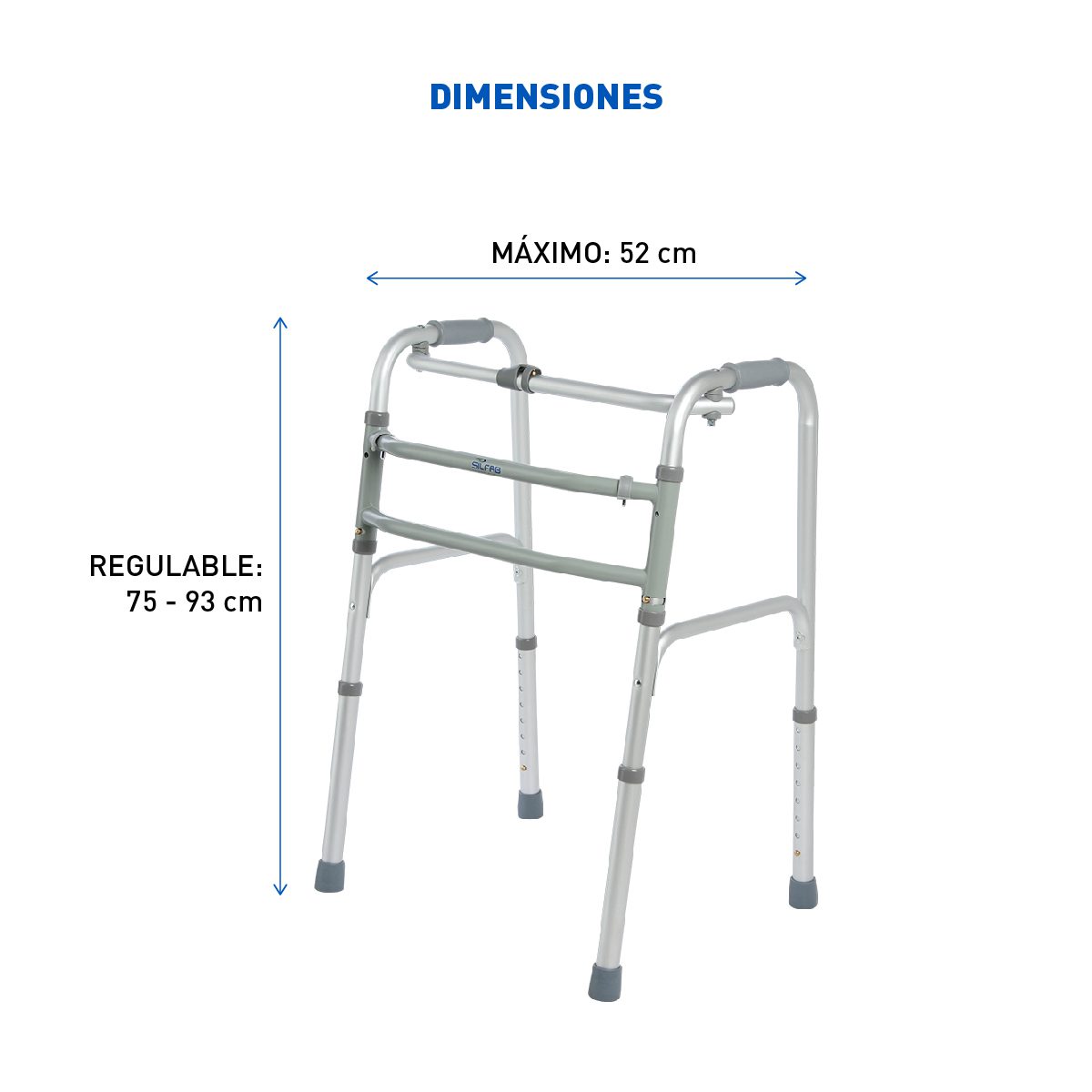 Andador para adultos. Hecho de aluminio anodizado, regulable en altura (8 posiciones cada 2.5 cm.) y plegable.