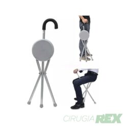 Bastón con asiento plegable, estructura de aluminio.Altura total 84 cm. Altura del asiento 50 cm.