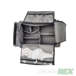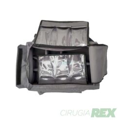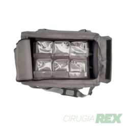 Existen muchos modelos de bolsos para emergencias pero no todos están diseñados para la implementación rápida y eficiente de elementos médicos en momentos críticos. Su amplio acceso permite abrir el cuerpo principal como un bolso convencional en un lado o una apertura superior que incluye 2 solapas visualizando todos los elementos médicos. En la parte externa de la primera solpa hay tres bolsillos transparentes rectangulares para facilitar la identificación y colocación de productos largos. El interior de esta solapa, cuenta con un bolsito transparente con cierre tipo cartuchera. En la segunda solapa, en su exterior posee seis bolsillos cuadrados cerrados con velcro. En el reverso tres más, rectangulares. Luego en la parte mas interna del bolso seis divisiones como paredes.