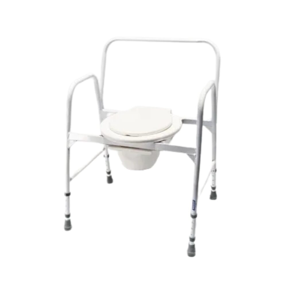 Eleva inodoro con respaldo, regulable en altura, de hierro pintado. Fabricado con caño (reforzado hasta 150kg) Incluye: bacinilla plástica. Asiento de inodoro.