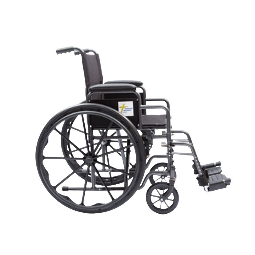 Silla de ruedas resistente y funcional, ideal para uso diario. Cuenta con estructura de acero, plegado lateral para fácil transporte, apoyabrazos tipo escritorio desmontables y apoyapiés removibles. Asiento y respaldo de tela ignífuga, ruedas traseras de goma maciza con llantas estilo americano y frenos manuales laterales. Soporta hasta 136 kg y está disponible en distintos anchos de asiento para mayor comodidad. Ideal para movilidad segura y práctica.